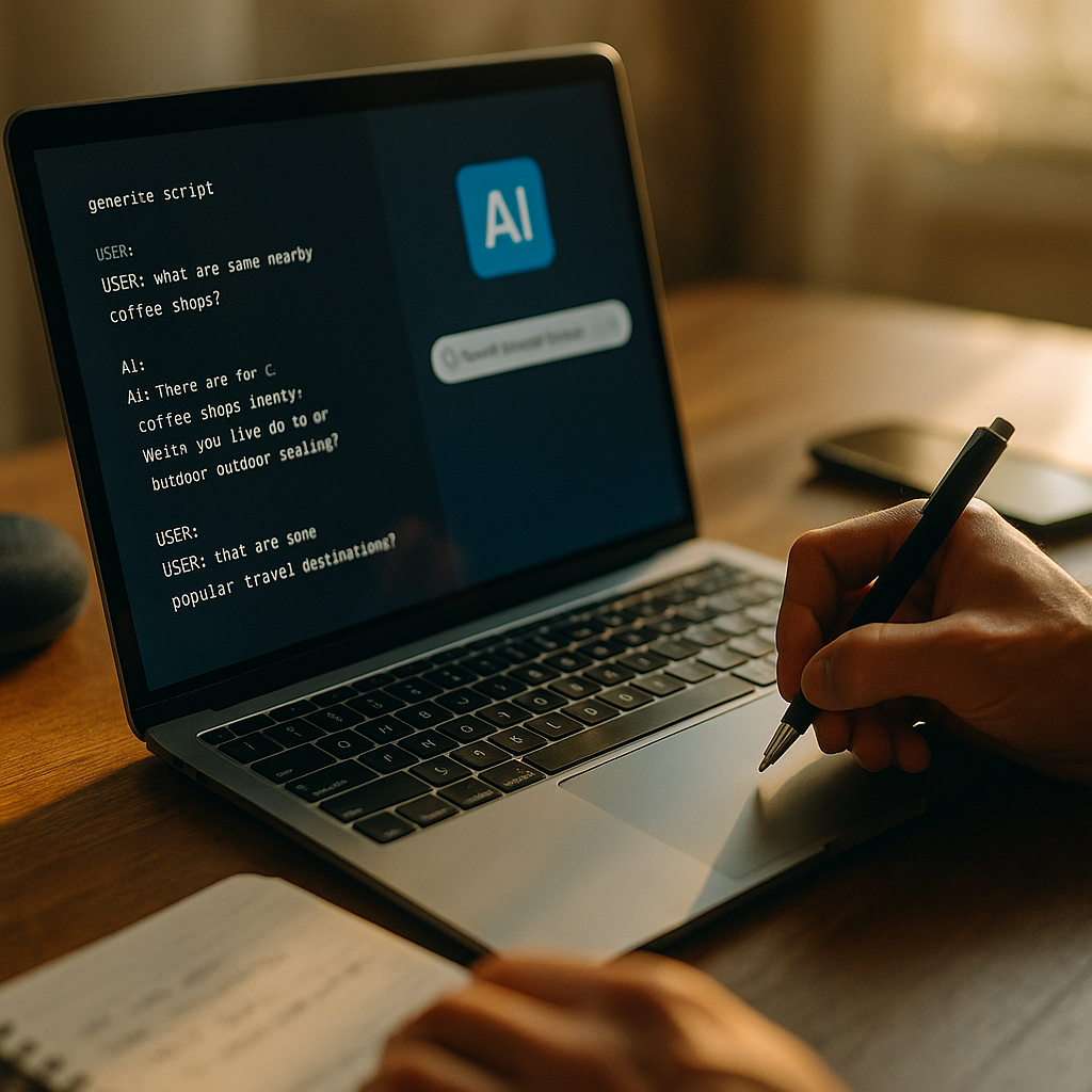 It is the use of AI tools to help plan, draft, and refine content scripts (for pages, videos, chat flows, and FAQs) that answer real user questions in a way that conversational assistants and generative search systems can summarize accurately.