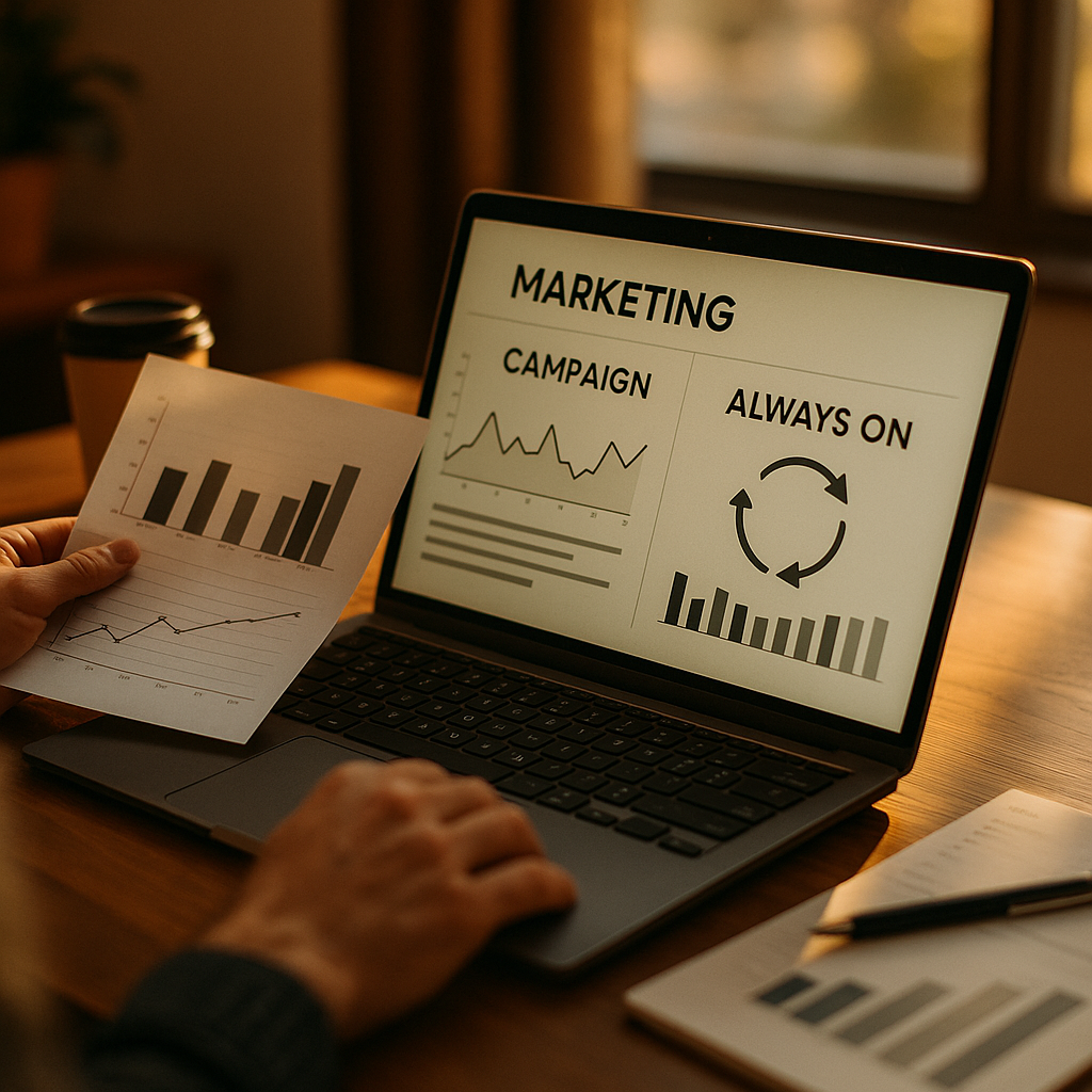 Campaign-based marketing runs in time-bound bursts around launches or promotions. Always-on marketing maintains continuous visibility and conversion readiness through consistent content, search presence, lifecycle messaging, and optimization—then uses campaigns as accelerators rather than the only growth engine.