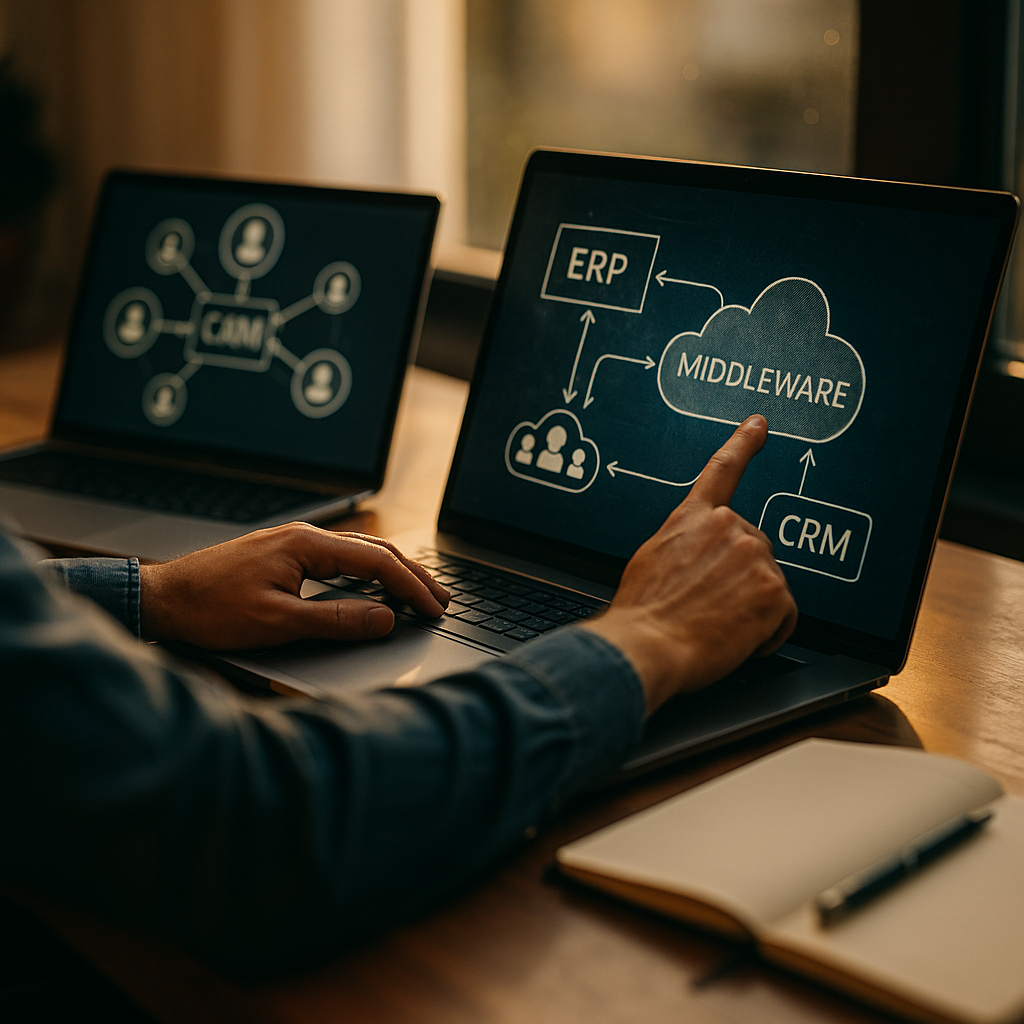 Middleware is the software layer that connects a CRM with internal and external systems. It handles data movement, transformation, workflow orchestration, monitoring, and security so systems can work together without direct one-off integrations.